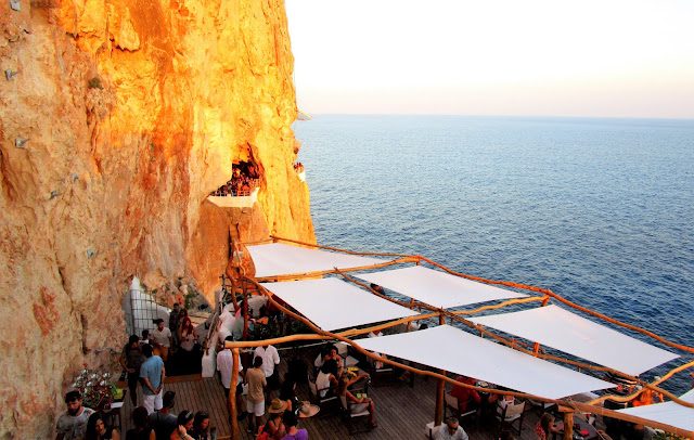 Bem próximo da Cala en Porter, no alto da colina, fica a Cova d’en Xoroi, um bar num espaço cavado na rocha, formando um conjunto de cavernas e túneis, pendentes sobre o mar, onde funciona uma espécie de bar-discoteca que é bastante frequentado pelos turistas. Até às 15h o espaço é de frequência mais generalizada, mesmo para quem vem com roupa de praia. Depois dessa hora, e sobretudo a partir do final da tarde, é exigido algum cuidado no dress-code, embora se aceite o “casual”, mesmo as havaianas e os calções. Nessa hora o preço dos ingressos aumenta para 12€ com direito a um refrigerante ou uma cerveja. Já lá dentro e com a possibilidade de desfrutarmos de uma vista infinita sobre o mar, optámos por fazer o upgrade às bebidas e, por mais 3€ por pessoa, bebemos umas caipirinhas (sem álcool, para as miúdas) e uns gins.